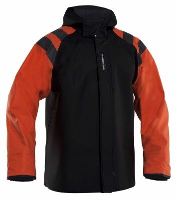 Jakke med justerbar hette. Doble skjulte knapper med stormklaffer. Forsterkede ermer med neoprene mansjetter. Refleks påskuldrene. Lengde bak i størrelse L er 82cm.PVC materiale. Vekt 480g/m2. Str. XS-3XL