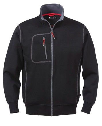 Rød kontrastfarge i krage og på logoglidelås. Framlommer.Brystlomme med glidelås. Ribbestrikkede mansjetter og nedkant ielastan. Vekt 320g/m2 Str. S-3XL