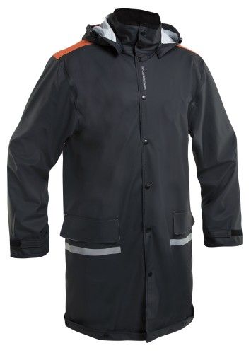 3/4 lang frakk med knapper og storm klaffer.Avtagbar hette. Åkpå baksiden for bedre ventilasjon og drypp kant med drenering.Kordfløyel krage og lommer foran med D-ring for Id kort. Lengde baki størrelse L er 100cm.