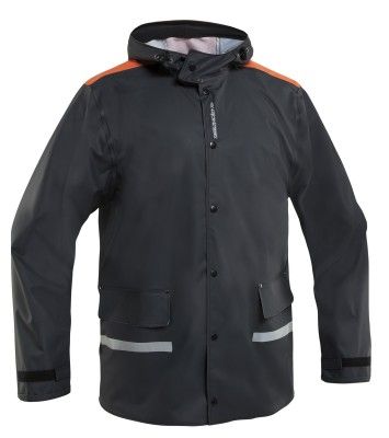 Jakke med knapper og storm klaffer, justerbar hette og ermer.Åk på ryggen for bedre ventilasjon. Lommer foran med D-ring for Idkort. Lengde bak i størrelse L er 82cm.Vekt 250g/m2 Str. XS-5XL