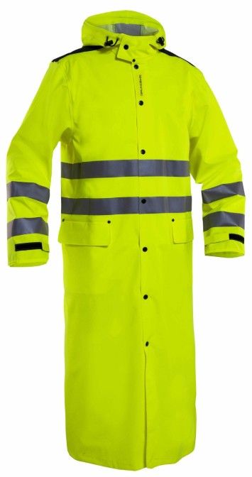 Lang frakk med knapper og storm klaffer. Justerbar hette ogermer. Splitt på baksiden for bedre bevegelighet og Åk bak forbedre ventilasjon. Lommer foran med D-ring for Id kort. Lengde baki størrelse L er 135cm.