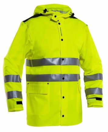 Jakke med knapper og storm klaffer. Justerbar hette og ermer.Åk bak for bedre ventilasjon. Lommer foran med D-ring for Id kort.Lengde bak i størrelse L er 82cm.PVC materiale. Vekt 250g/m2 Str. XS-5XL