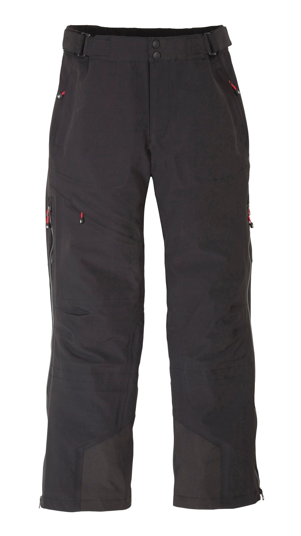 Tapede sømmer. Toveis laminert (vannavvisende) glidelås langs utsiden av ben. Stikklommer med skjult glidelås. Lårlomme med skjult glidelås. Avtag og regulerbare elastiske seler. Regulerbar fleeceforet linning med borrelåslukning. Forsterket nederst på ben.Vannsøyle 5000mm.