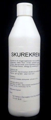 SkurekremDette er et slipende rengjøringsmiddel for sanitærutstyr, fliser,emalje, porselen og rustfritt stål.Med sin milde poleringseffekt fjerner den gjenstridige flekker,belegg og vanskelig skitt.