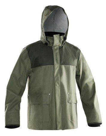 Jakke med børstet polyester på innsiden. Justerbar hette somkan legges inn i kragen. Glidelås og skjulte knapper. Åk bak forbedre ventilasjon og neoprene mansjetter i ermene.